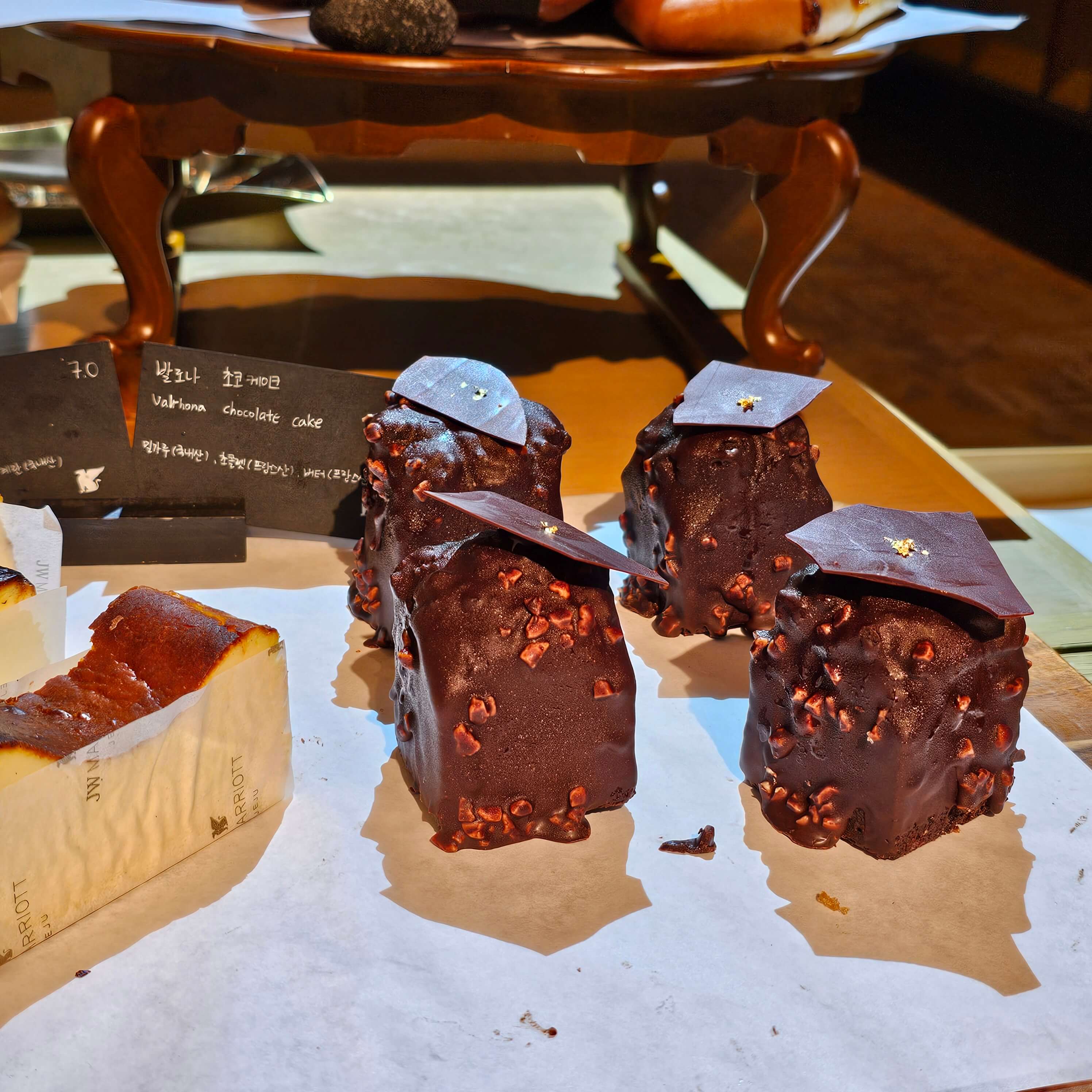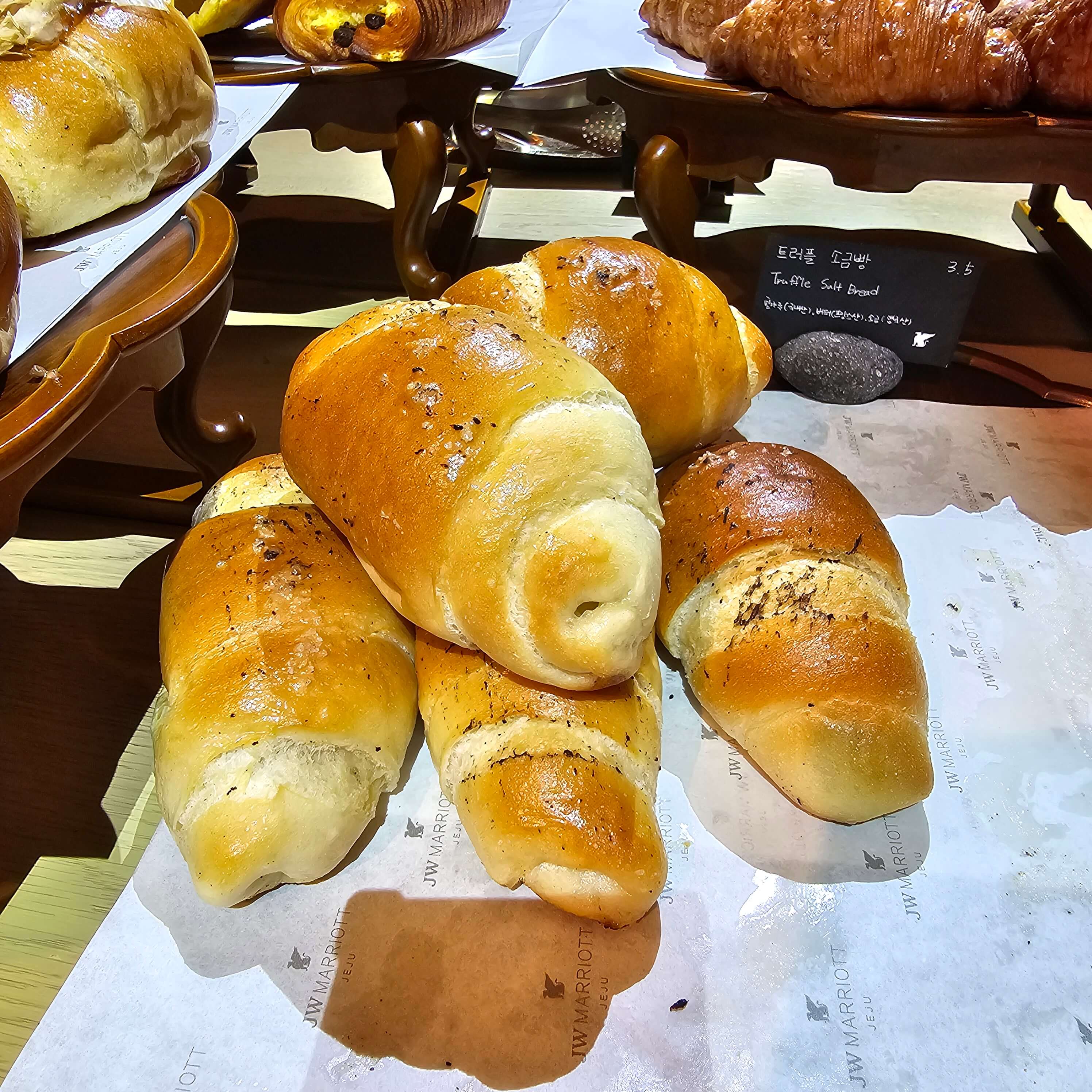 다양한 댄싱 두루미의 빵들 소금빵, 크루와상부터 단팥빵과 케잌류까지 다양하게 있었습니다. 전 발로나 초코케이크와 바질토마토 보트포카치아, 제주 파 크림치즈 소금빵 그리고 소시지빵을 주문했습니다.